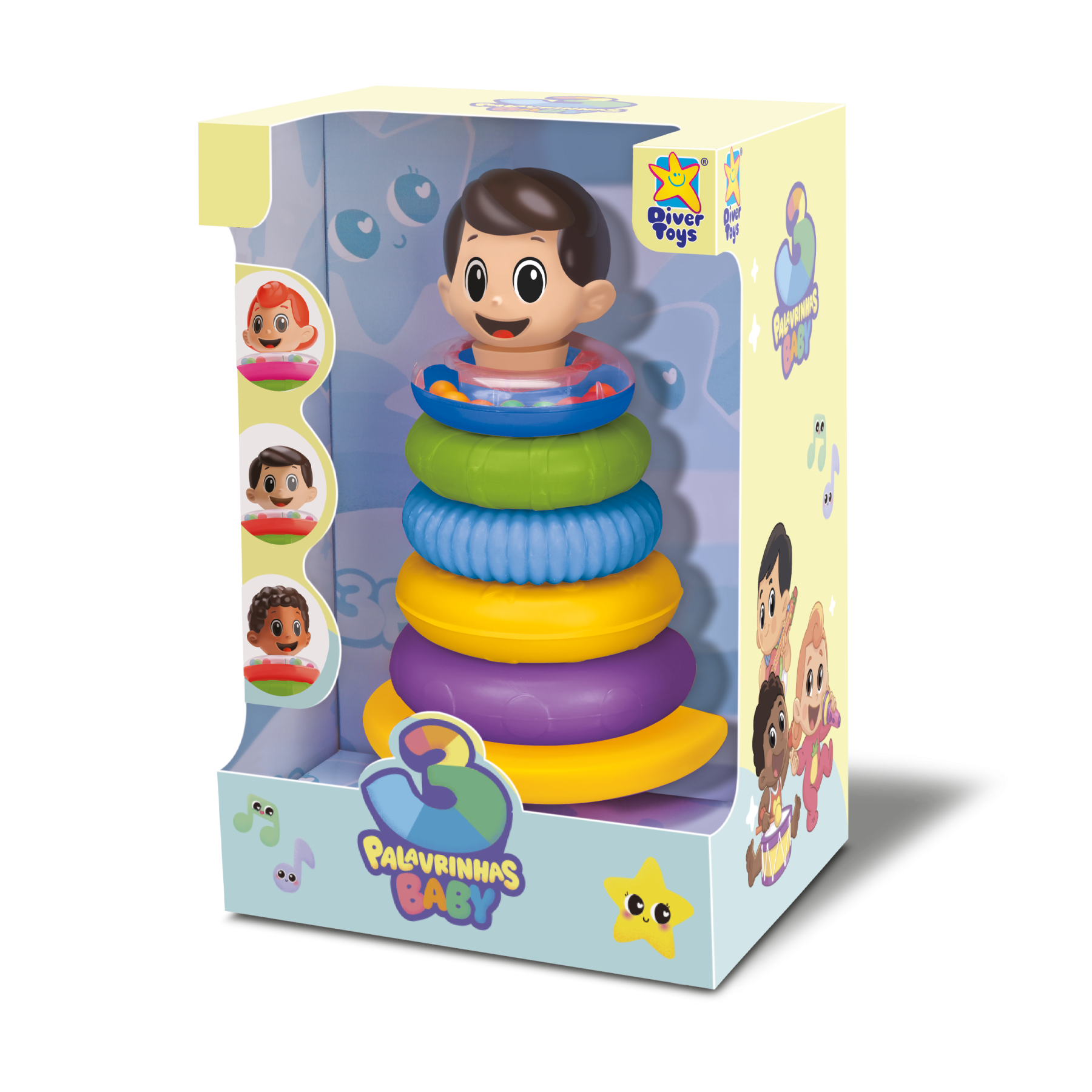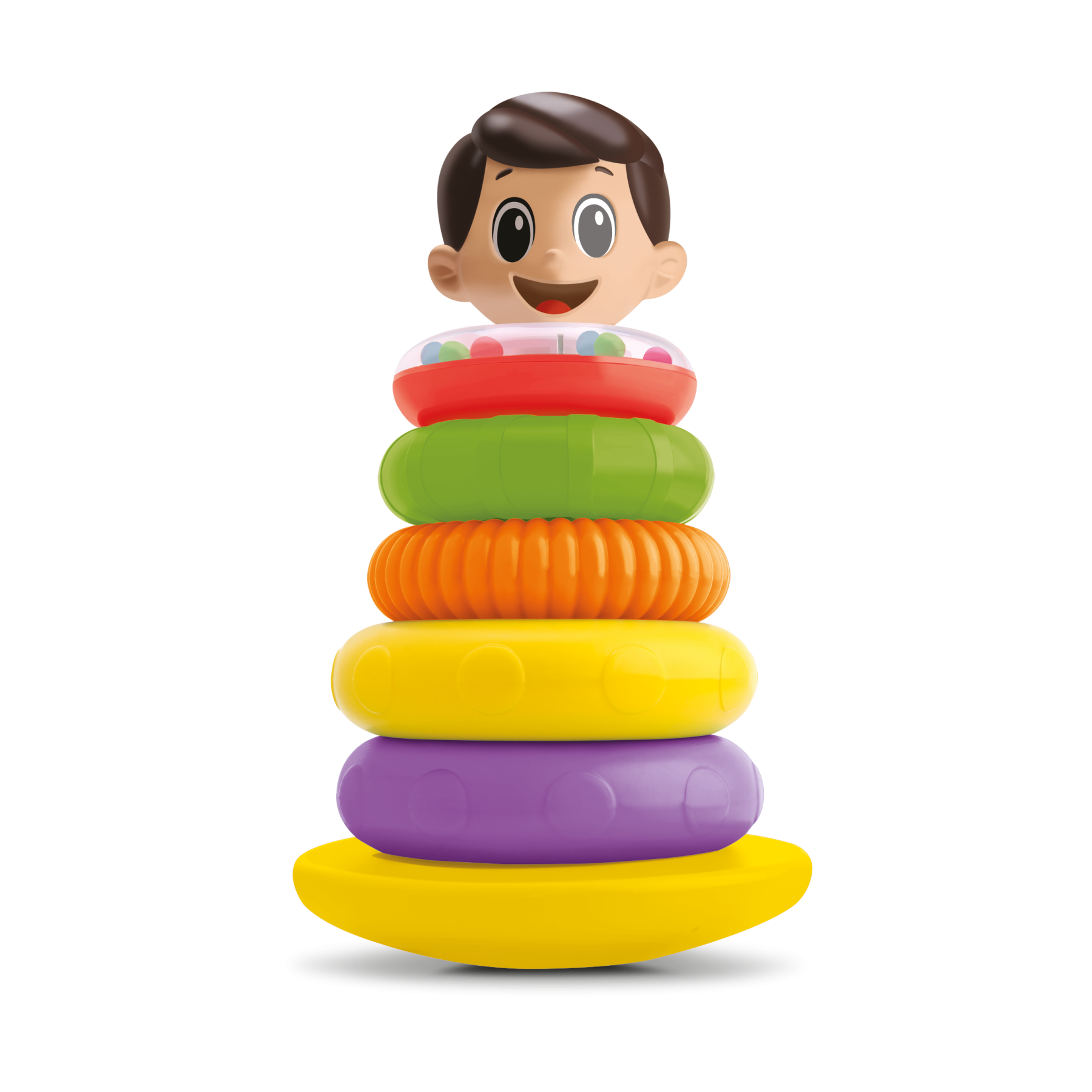 A pirâmide de argolas é um brinquedo clássico para as crianças da primeira infância, possui bolinhas coloridas que fazem barulhos e cabecinha é feita de vinil atóxico. - Informação Adicional