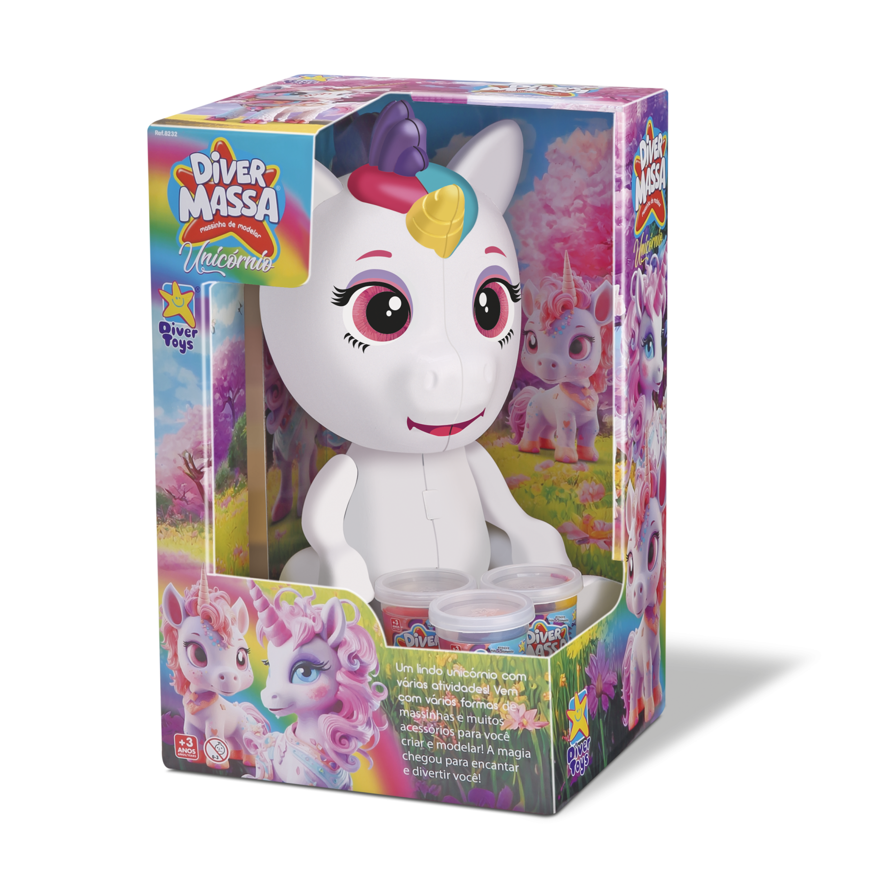Um lindo unicórnio com várias atividades! Vem com várias formas de massinhas e muitos acessórios para você criar e modelar. A magia chegou para encantar e divertir você! Acompanha 3 potes de massinhas com três cores. - Informação Adicional