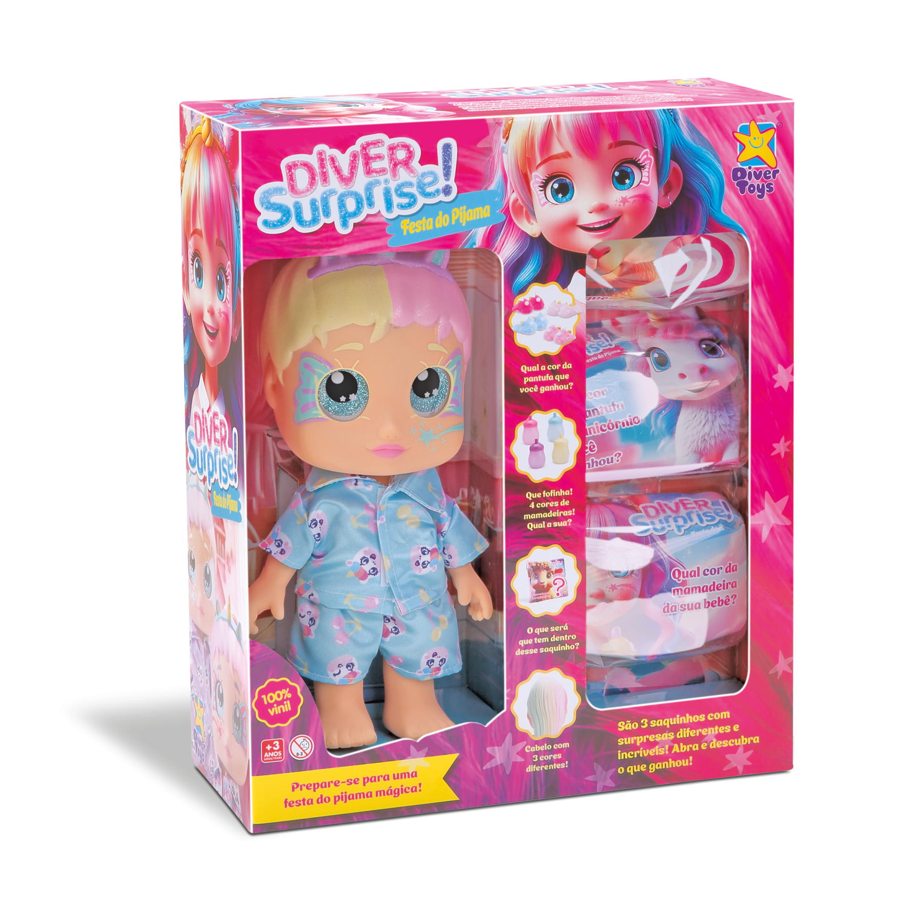 Prepare-se para uma festa do pijama mágica! Ela é pura diversão, com cabelos em várias cores diferentes que você vai adorar pentear e estilizar! Vem com 3 saquinhos surpresas!