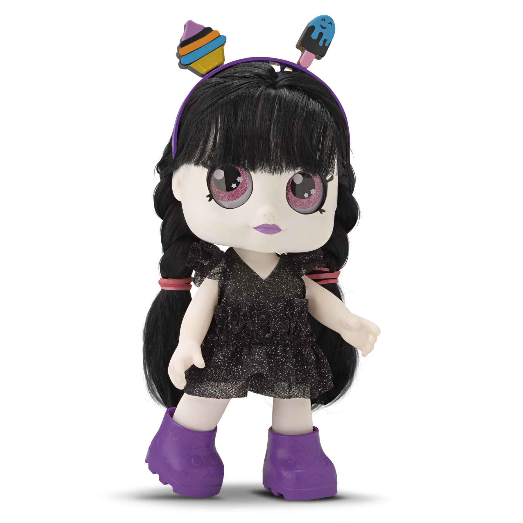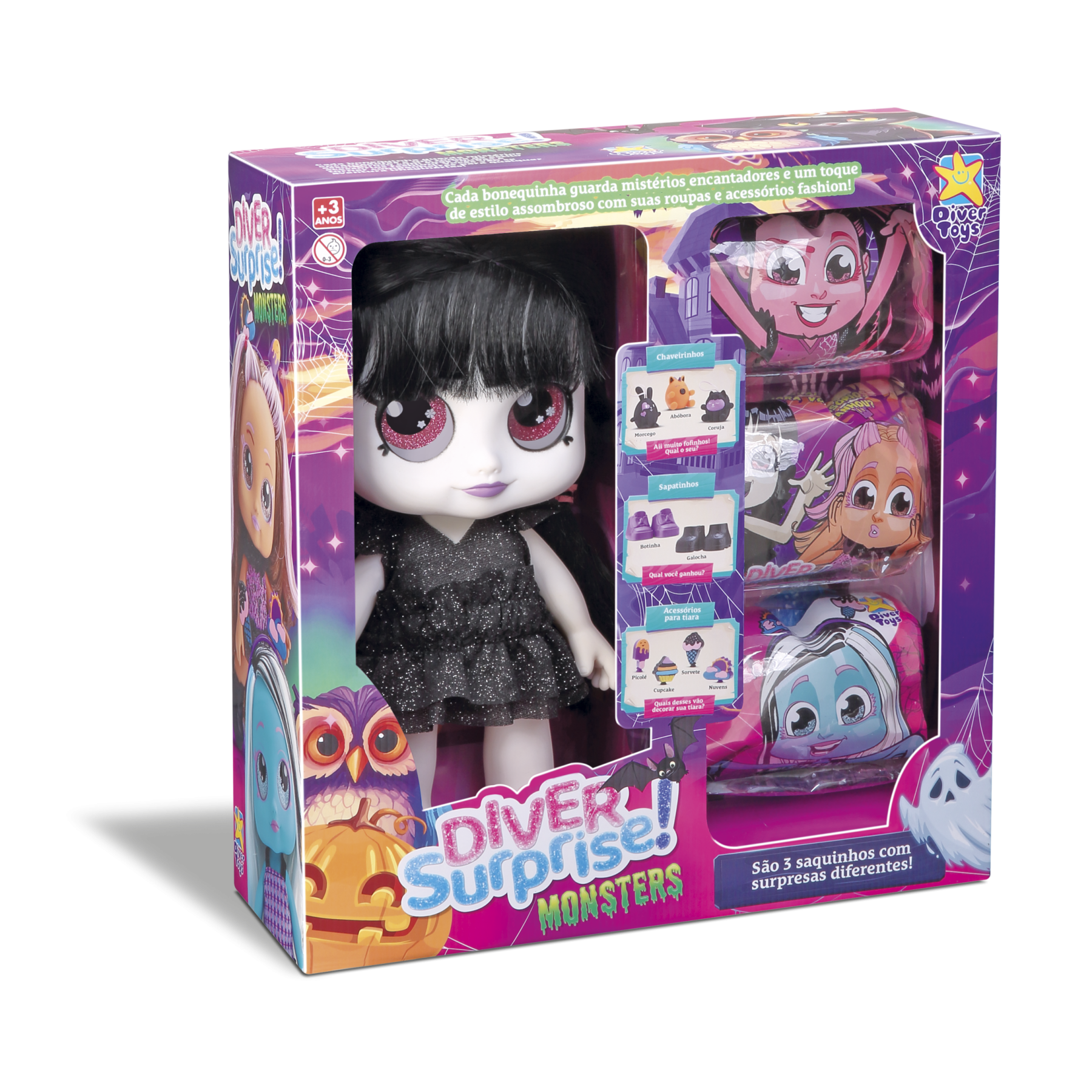 Assustadoramente fofa! Tem um visual super fashion com cabelos pretos longos e olhos vermelhos brilhantes e um vestido estilizado. 3 saquinhos com surpresas diferentes! - Informação Adicional