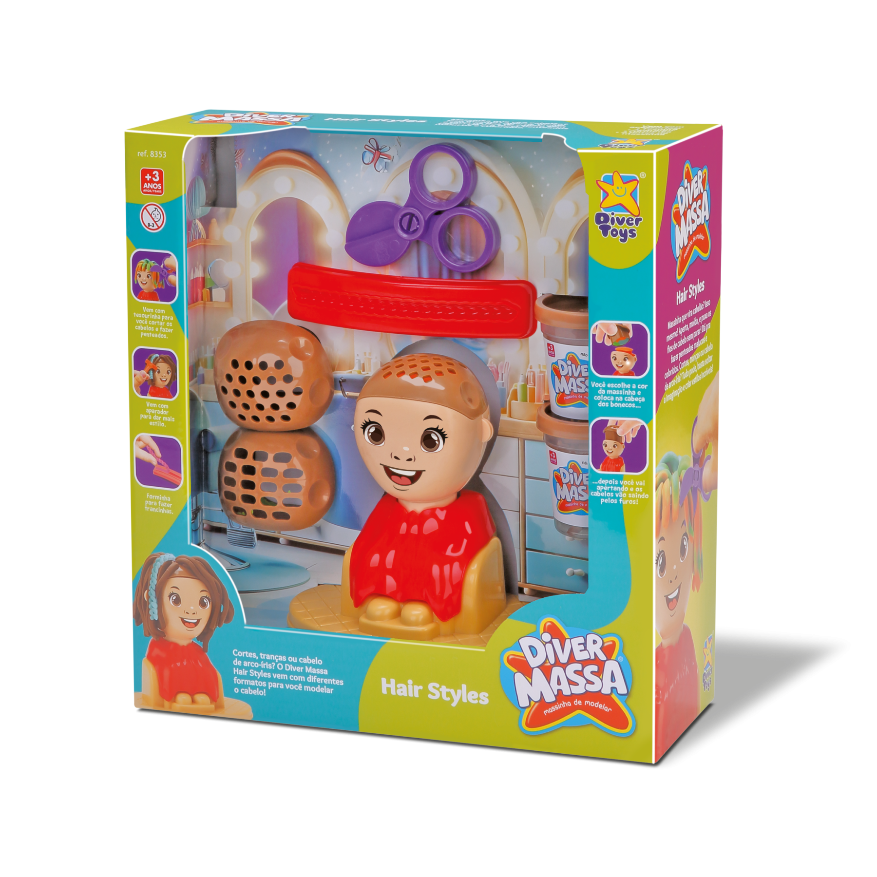 Você escolhe a cor da massinha e coloca na cabeça do boneco, aperta e assim saem os cabelinhos de massinha pelos furos. Vem com várias ferramentas para brincar com as massinhas!