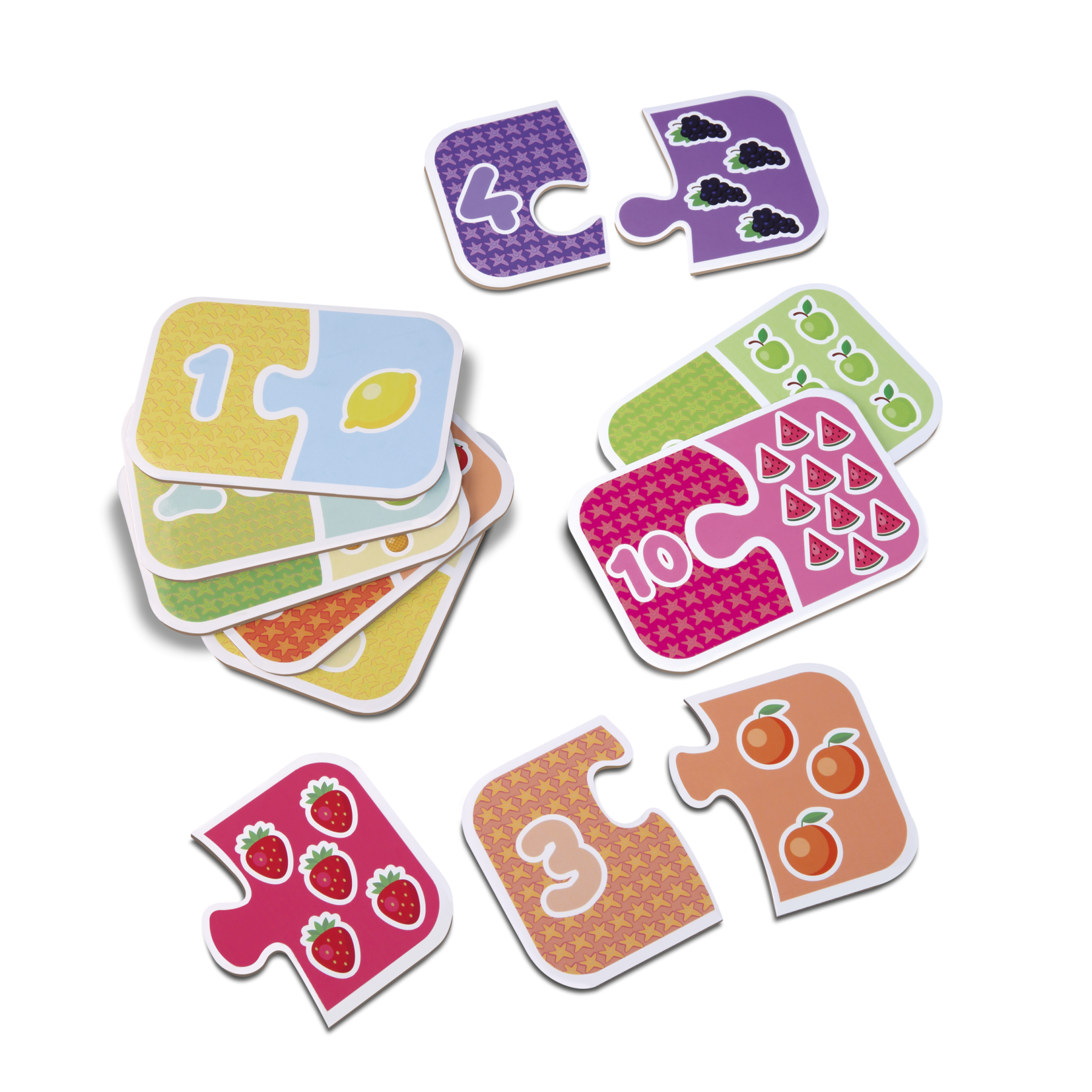 São 20 peças feitas em madeira reciclada, colorida e resistentes para a criança contar as frutinhas e encaixar a peça ao número correspondente!