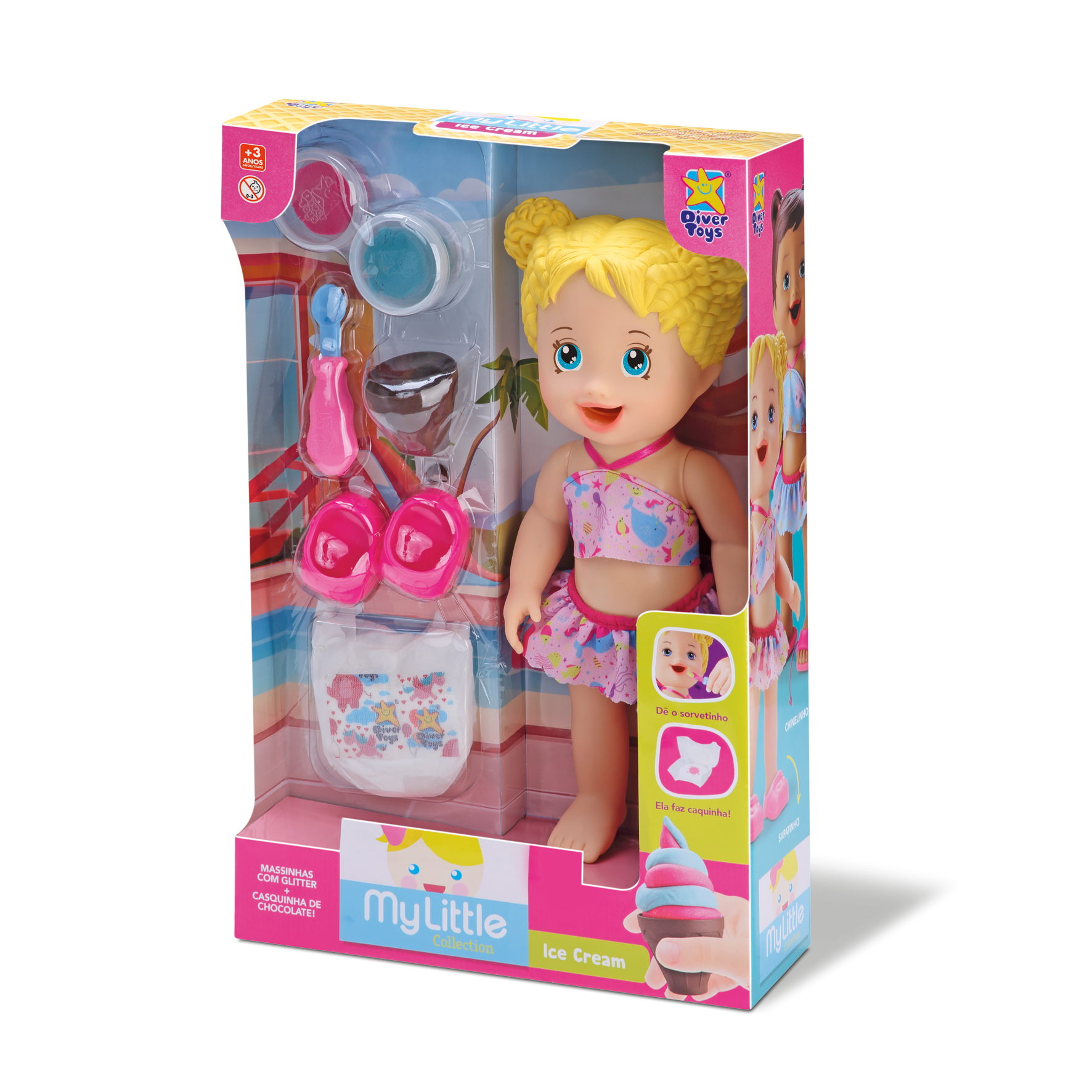 Coloque a fraldinha na bonequinha, dê sorvetinho de massinha...ops! Um cocôzinho! Vem com chinelinho ou sapatinho, fraldinha, colher retrátil e 3 potinhos de massinha com glitter. - Informação Adicional