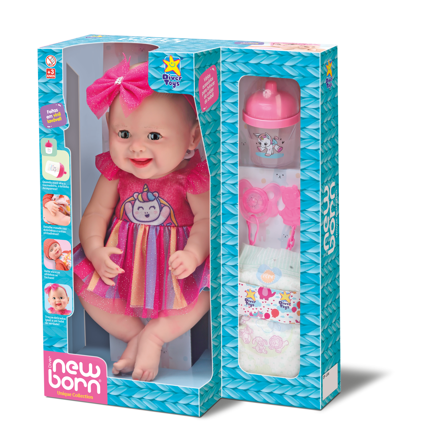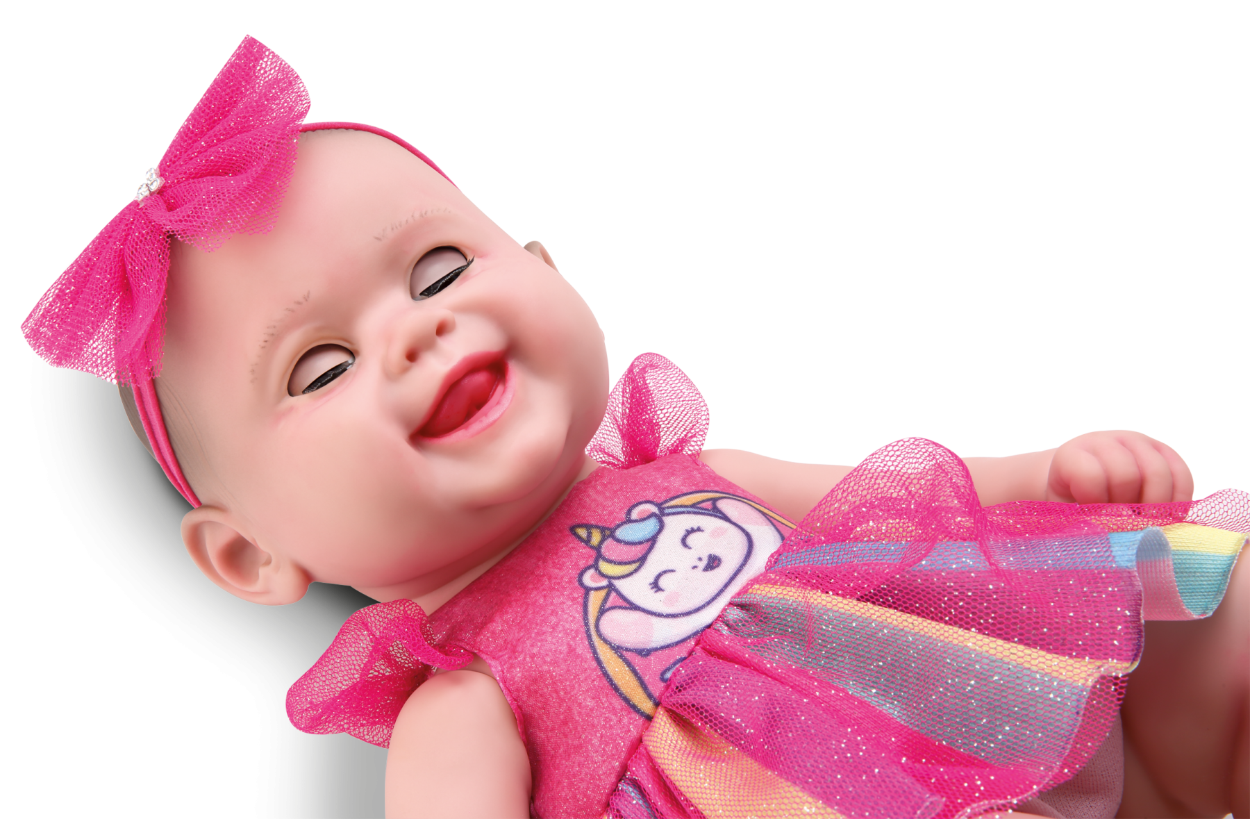 Detalhes rosados nas bodrinhas e unhas pintadinhas. Parece um bebê de verdade! Acompanha chupeta com corrente, mamadeira mágica e fraldinha descartável.